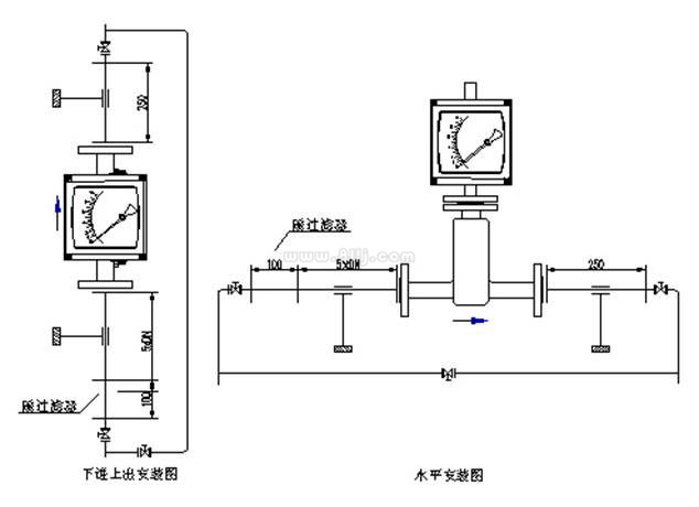 流量計垂直安裝,流量計中心線與鉛垂線的夾角不超過5°,在流量計的上游須保證五倍公稱通徑的入口直管段,下游保證250mm出口直管段。如果介質中含有固體雜質,應在流量計上游加裝過濾器;如果介質中含有鐵磁性物質,應在流量計的上游安裝磁過濾器。為了便于維護和清洗且不影響生產,建議安裝旁通管路。為了避免由于管道引起的流量計變形,安裝法蘭必須與儀表同軸并且相互平行,并適當地支撐管道以避免管道振動和減小流量計的軸向負荷,測量系統中控制閥應安裝在流量計的下游。用于測量氣體時,應保證管道壓力不小于5倍流量計的壓力損失,以使浮子穩定工作。