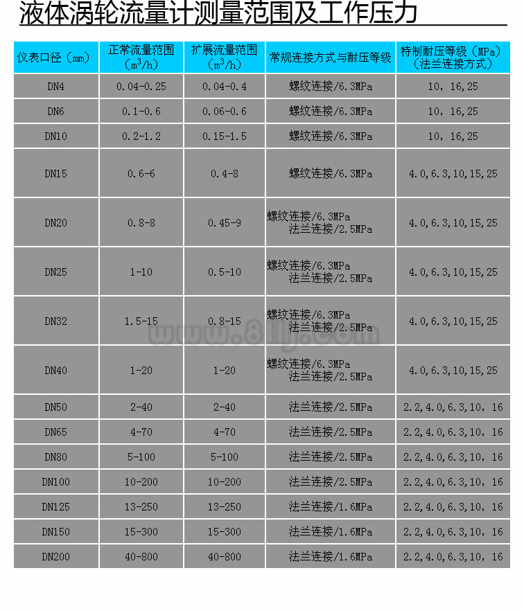 ?范圍度寬,中大口徑可達1:20,小口徑為1:10;渦輪流量計渦輪流量計結(jié)構(gòu)緊湊輕巧,安裝維護方便,流通能力大;適用高壓測量,儀表表體上不必開孔,易制成高壓型儀表;