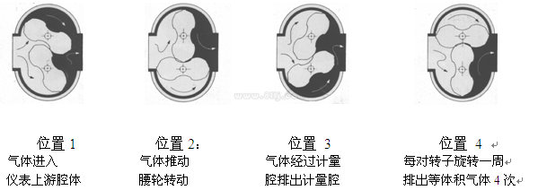 智能氣體腰輪流量計,主要由殼體、共軛轉子和智能流量積算儀等部件構成。裝于計量室內的一對共軛轉子在流通氣體的出入口壓差(P入>P出)作用下,通過精密加工的調校齒輪使轉子保持正確的相對位置。轉子間、轉子與殼體、轉子與墻板間保持蕞佳工作間隙,實現了連續的無接觸密封。轉子每轉動一周,則輸出四倍計量室有效容積的氣體。其計量過程和工作原理如圖1所示(圖中僅表示了四分之一周期)。